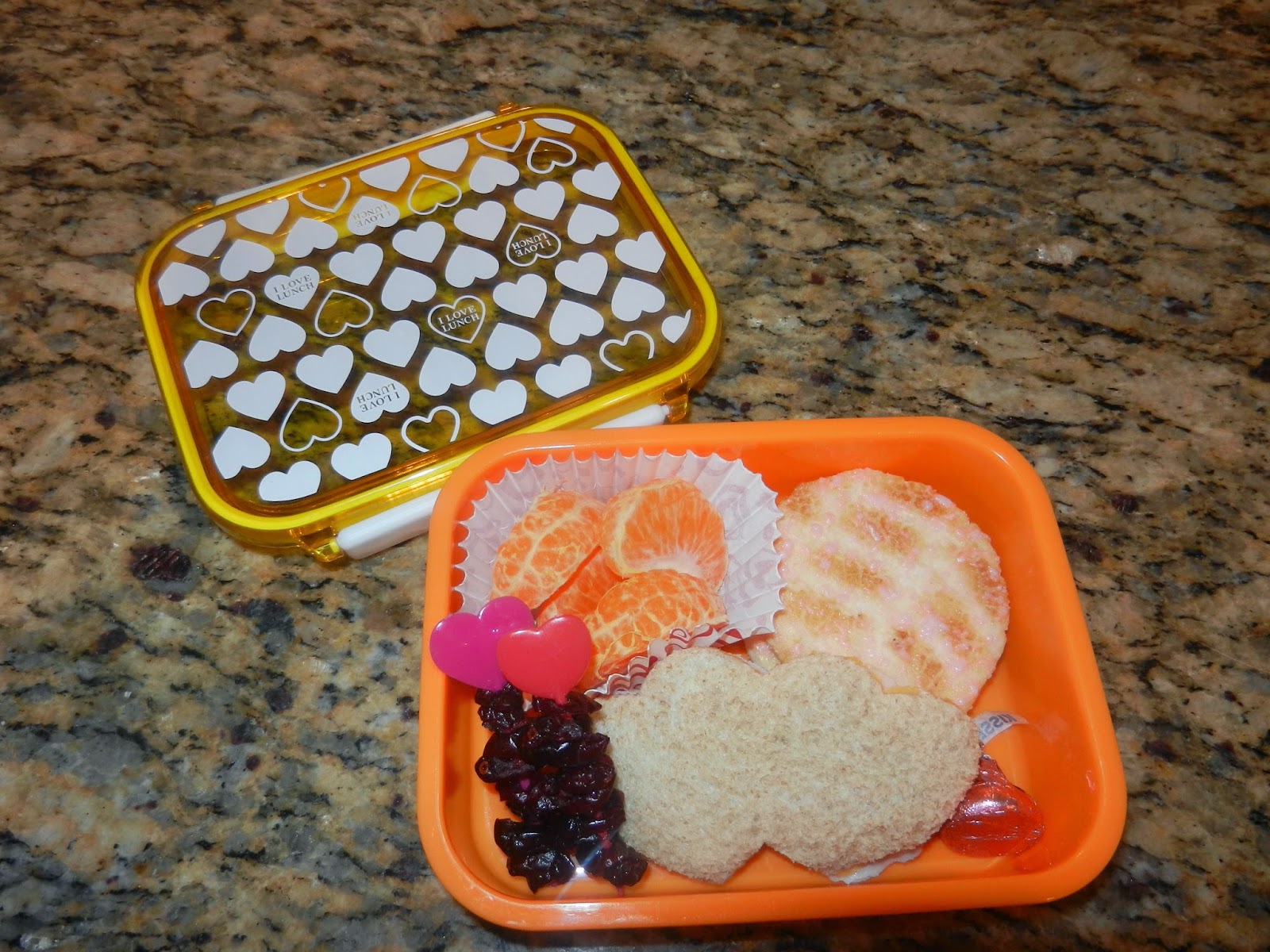 Turkey and cheese double heart sandwich, Craisins on heart picks, tangerine segments, senbei with strawberry drizzle and a kiss.